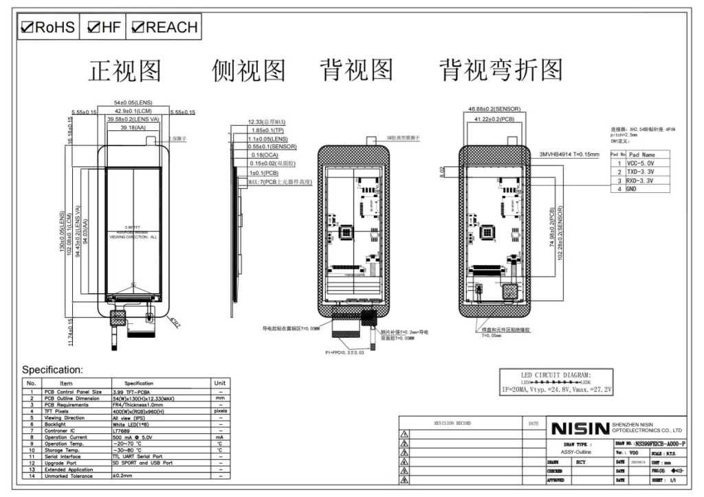 Dimensiones de la pantalla del puerto serie: 54.0*130.0*12.33milímetros